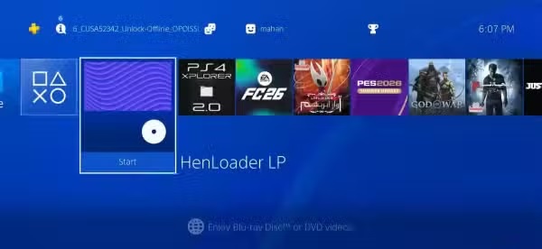 ۲- دیسک Blu-Ray و فلش USB حاوی فایل گلدهن GoldHEN را که از قبل آماده کرده اید به کنسول متصل کنید هرکدام را سر جای خود و صبر کنید تا آیکون یک دیسک به منوی بازی های شما با عنوان HenLoader LP اضافه بشه